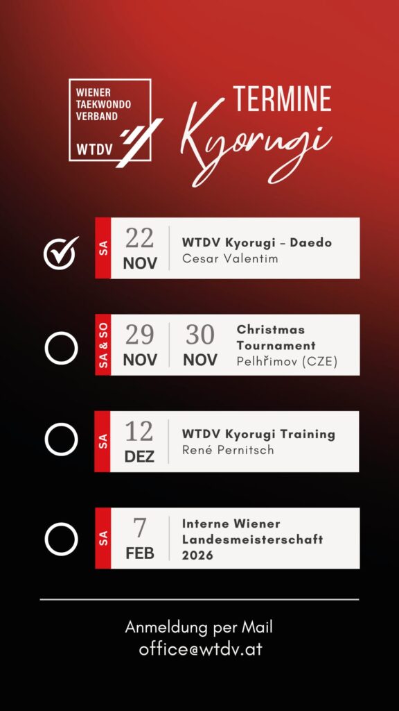 Der Wiener Taekwondo Verband entsandte letztes Novemberwochenende erfolgreich ein ausgewähltes Team zum 29. Christmas Tournament nach Pelhřimov in Tschechien. Das stark besetzte internationale Turnier, an dem Athletinnen und Athleten aus 11 Nationen teilnahmen, bot ein anspruchsvolles sportliches Umfeld und eine hervorragende Gelegenheit, internationale Kampferfahrung zu sammeln.